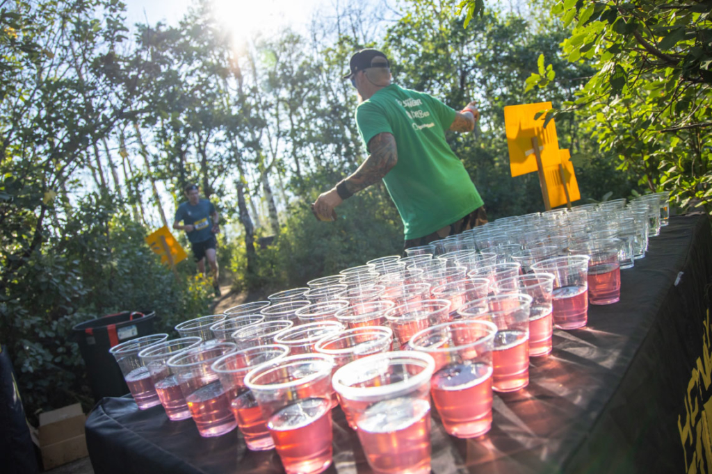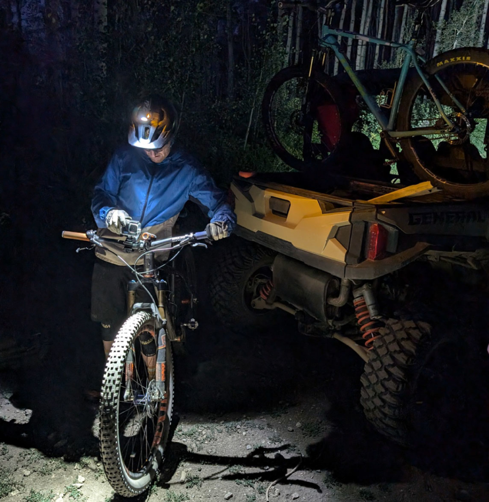 It’s just before the break of dawn on Emerald Mountain, and dust kicking up around the ATV creates thick beams of light out ahead on Lane of Pain. Racers will line up near the Stables in a couple of hours, ready to conquer some serious mileage up and over the mountain. I’m shuttling Rob and Nate up to the summit, where they will descend on bikes and check the course one last time. They are kitted to the extreme – megawatt headlamps, folding saws, backpacks full of stakes, staple guns, portable speakers. Whereas typically the act of blaring music out loud along the trail would constitute a significant faux pas, in this instance it’s utilitarian. The noise warns the early-morning critters of our team’s passage, and prevents these sleepy riders from dozing off behind the handlebars. It’s quite common for either guy to encounter lumbering moose, hungry black bears, or the errant grouse thumping its wings in a hot bother on their way down to the base.